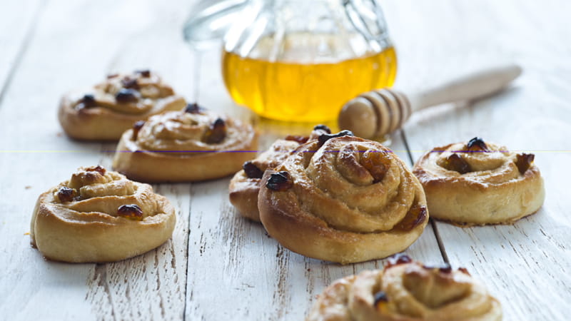 - Μεταφέρουμε τη ζύμη σε επίπεδη επιφάνεια εργασίας. Πασπαλίζουμε με αλεύρι και την ανοίγουμε, μέχρι να έχει περίπου 0,5 εκατοστά πάχος. Καλύπτουμε τη ζύμη με μέλι και πασπαλίζουμε με μαύρη ζάχαρη και σταφίδες. Τυλίγουμε τη ζύμη γύρω από τον εαυτό της, για να δώστε αυτή τη στριφογυριστή όψη. Κόβουμε σε φέτες. Τοποθετούμε τα cookies σε λαδόκολλα, αφήνοντας κάποιο χώρο μεταξύ τους, καθώς πρόκειται να φουσκώσουν κι άλλο. Τα σκεπάζουμε με μια πετσέτα και τα αφήνουμε να φουσκώσουν για άλλα 15 λεπτά.